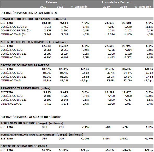 LATAM Airlines Group S.A. y sus filiales (“LATAM Airlines Group”, “Grupo LATAM Airlines” o “la Compañía”) (NYSE: LTM / IPSA: LTM) el grupo de aerolíneas líder de Latinoamérica en el transporte de pasajeros y carga, dio a conocer hoy las estadísticas preliminares de tráfico para febrero 2019 comparadas con dicho mes de 2018.