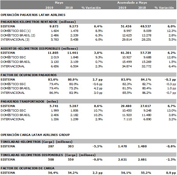 LATAM Airlines Group S.A. y sus filiales (“LATAM Airlines Group”, “Grupo LATAM Airlines” o “la Compañía”) (NYSE: LTM / IPSA: LTM) el grupo de aerolíneas líder de Latinoamérica en el transporte de pasajeros y carga, dio a conocer hoy las estadísticas preliminares de tráfico para mayo 2019 comparadas con dicho mes de 2018.