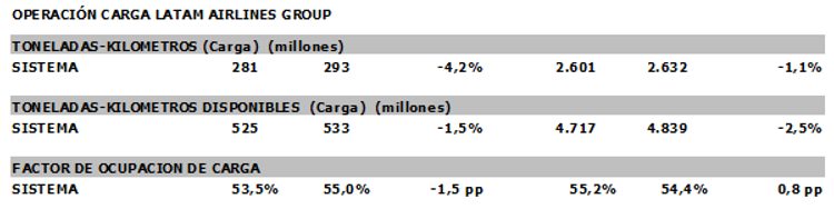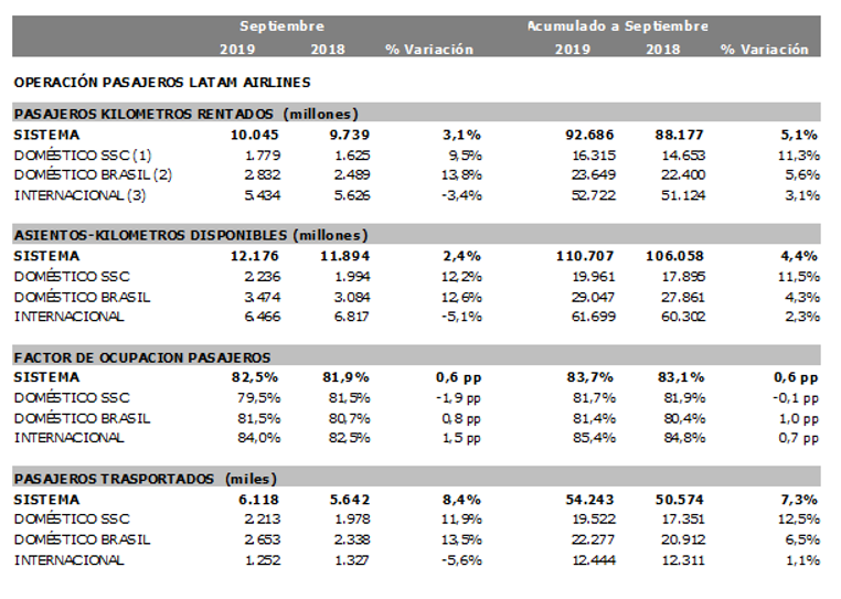 La siguiente tabla resume las estadísticas operacionales para el mes y el acumulado a septiembre para las principales unidades de negocio de LATAM: