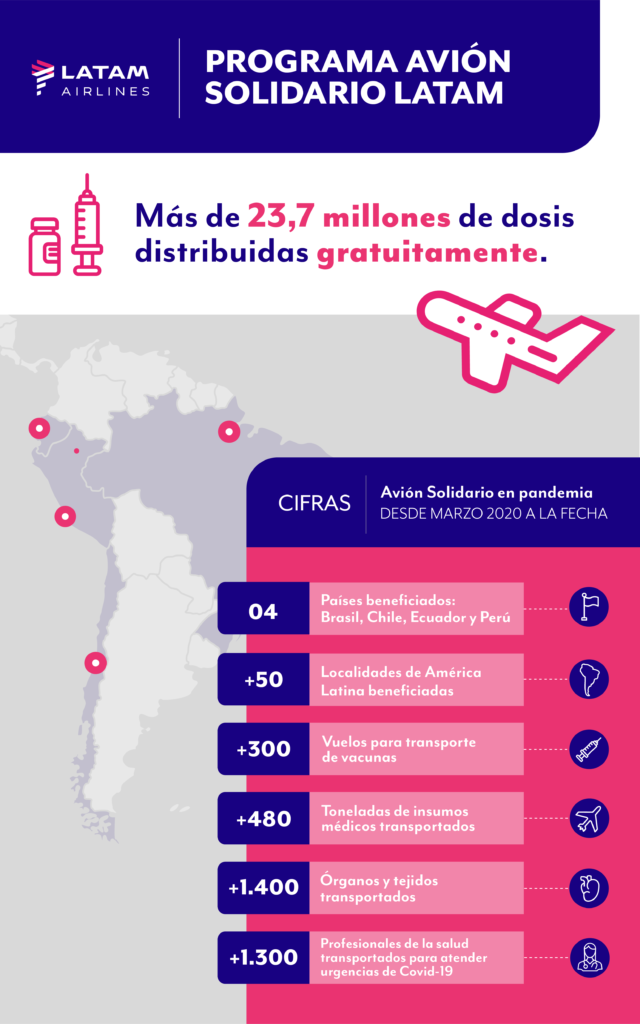 Desde el inicio de la pandemia hasta la fecha, Avión Solidario ha transportado más de 480 toneladas de insumos médicos, beneficiando a Argentina, Brasil, Chile, Colombia, Ecuador y Perú. Paralelamente se movilizaron más de 1.400 órganos y tejidos dentro de Sudamérica y se concretó el traslado de células madre para diez personas con cáncer de sangre, quienes pudieron recibir una segunda oportunidad de vida. En transporte de pasajeros, más de 1.300 profesionales de la salud pudieron viajar para atender distintas necesidades relacionadas con el Covid-19 en los países que opera LATAM con vuelos domésticos.