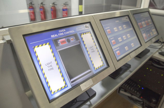 Otros simulacros mediante humo y luces led los encontramos en los compartimentos superiores de equipaje, papelera, cafetera e incluso en una batería simulada dentro de una maleta. Todos estos “fuegos simulados” así como el fuego real del horno, se controlan desde una estación de instructor muy visual e intuitiva, dotada de pantallas táctiles para su fácil manejo.