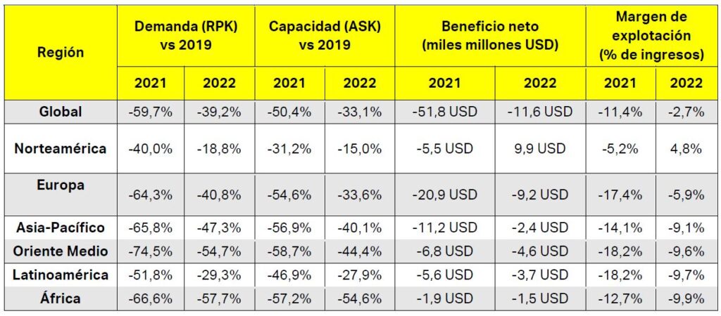 • Los operadores de Oriente Medio verán una mejora muy limitada en su desempeño financiero con pérdidas de los 6.800 millones USD en 2021 a los 4.600 millones USD en 2022. Sin grandes mercados domésticos, los principales operadores de la región dependen significativamente del tráfico de conexión, especialmente hacia Asia-Pacífico, cuya apertura al tráfico internacional está siendo lenta.