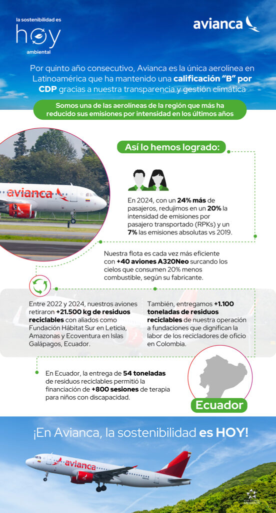 Por quinto año consecutivo, Avianca fue reconocida por el Carbon Disclousure Project (CDP), organización global de referencia en la evaluación del impacto ambiental corporativo, con calificación “B”, una de las más altas en la región. Este hito consolida a la compañía como la única aerolínea en Latinoamérica en mantener este reconocimiento continuo en los últimos 5 años, reflejando su compromiso integral con la sostenibilidad y la transparencia en la acción climática.