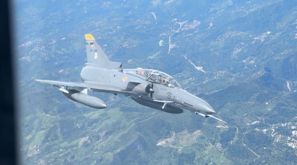 El “Júpiter” FAC 1202 despegó desde la rampa del CATAM volando hacia el área designada, para luego encontrarse en el aire con una aeronave Kfir, para tomar las referencias exactas del vuelo en formación y la demostración de reabastecimiento de combustible en vuelo, que engalanará los cielos capitalinos este sábado.