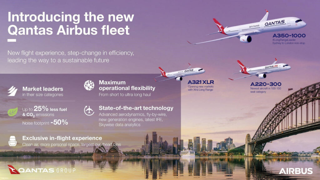 En la categoría de pasillo único, el A220 y el A321XLR fueron elegidos bajo una evaluación denominada Proyecto Winton. El avión será utilizado por Qantas Group en servicios nacionales en todo el país, que pueden extenderse a más de cinco horas. Además, el A321XLR ofrece la capacidad de rango para vuelos desde Australia al Sudeste Asiático, lo que permite a Qantas Group abrir nuevas rutas directas. Las flotas A220 y A321XLR estarán propulsadas por motores Pratt & Whitney GTF.