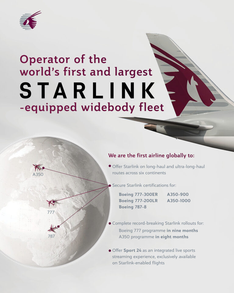 Qatar Airways sigue liderando la industria como operador de la mayor flota de aviones de fuselaje ancho equipados con Starlink del mundo y la primera aerolínea de la región MENA en ofrecer esta tecnología de vanguardia, lo que refuerza su reputación como la mejor aerolínea del mundo en cuanto a una experiencia de pasajero inigualable.