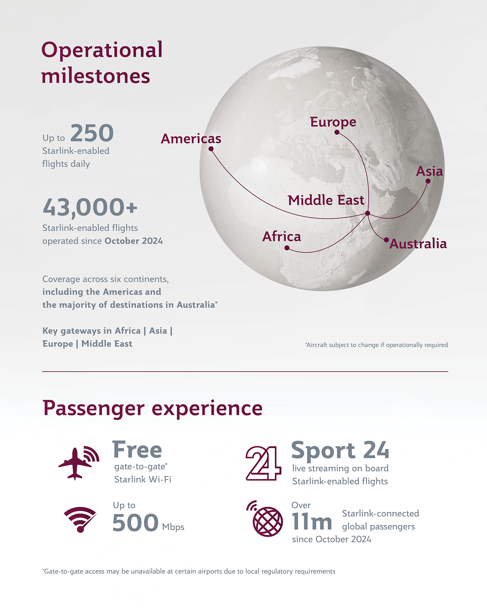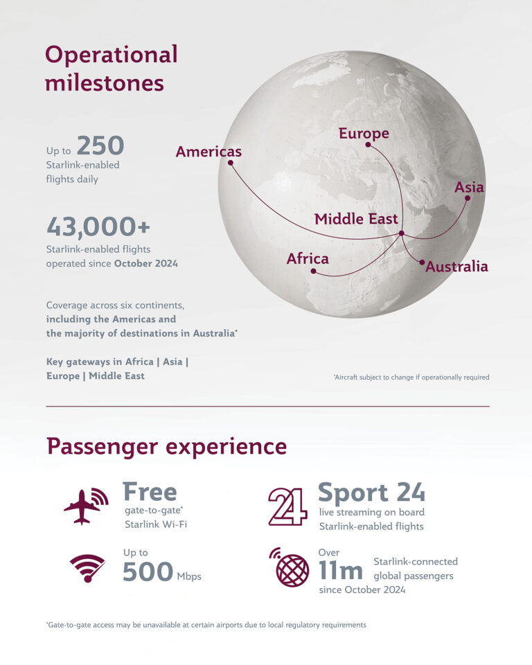 Qatar Airways, operador de la primera y mayor flota de aviones de fuselaje ancho del mundo equipada con Starlink, se ha convertido en la primera aerolínea a nivel mundial en habilitar Starlink en el Boeing 787-8. La aerolínea también equipó toda su flota de Airbus A350 en un plazo récord de ocho meses, en diciembre de 2025. Hasta la fecha, Qatar Airways opera tres Dreamliners con el WiFI más rápido del mundo, lo que eleva el total de sus aviones de fuselaje ancho conectados con Starlink a casi 120.
