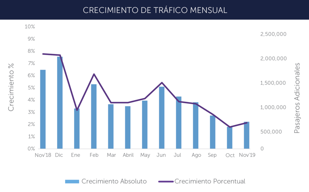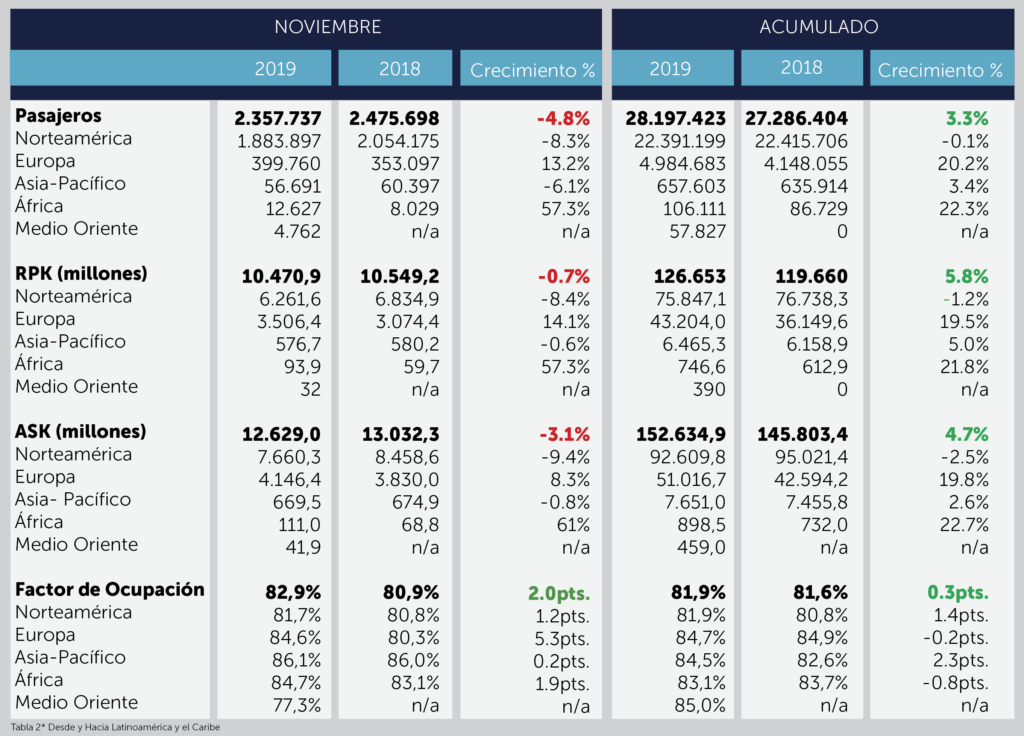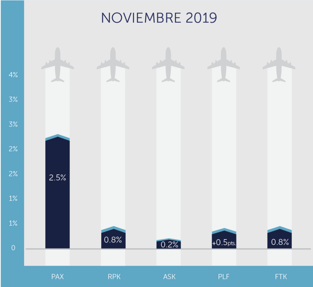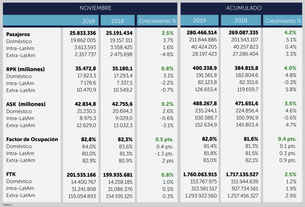 La Asociación Latinoamericana y del Caribe de Transporte Aéreo (ALTA) informa que las aerolíneas de Latinoamérica y el Caribe transportaron 25.8 millones de pasajeros en noviembre, lo que representa un crecimiento del 2.5% con respecto año anterior con 641.902 pasajeros adicionales (ver tabla 1). El tráfico (RPK) creció 0.8% y la capacidad (ASK) aumentó un 0.2%, con lo que el factor de ocupación alcanzó el 82.8%, equivalente a 0.5 puntos porcentuales más que en noviembre 2018.