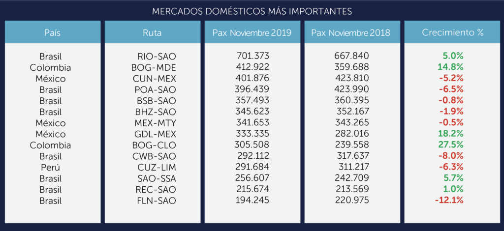 Las aerolíneas de Latinoamérica y el Caribe transportaron 19.9 millones de pasajeros domésticos en noviembre, lo que representa un incremento del 3.7% con respecto a 2018 (ver tabla 2). El tráfico (RPK) creció 3.1% y la capacidad (ASK) creció 2.6%, con lo que el factor de ocupación alcanzó el 84%.