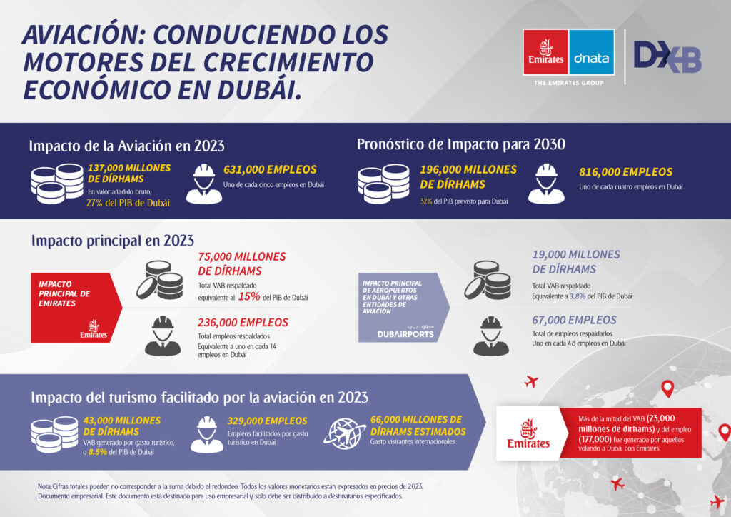 En total, se estima que el gasto turístico facilitado por la aviación ha contribuido en: 43.000 millones de dirhams en valor añadido bruto, o el 8,5% del PIB de Dubái, lo que supone la creación de 329.000 puestos de trabajo. Más de la mitad del VAB, 23.000 millones de dirhams, fue generado por quienes volaron a Dubái con Emirates. Además, se prevé que el turismo a Dubái crezca significativamente en los próximos seis años, y se espera que el gasto turístico facilitado por la aviación contribuya en 63.000 millones de dirhams en valor añadido bruto, equivalente al 10% del PIB previsto de Dubái, así como uno de cada ocho puestos de trabajo en Dubái.