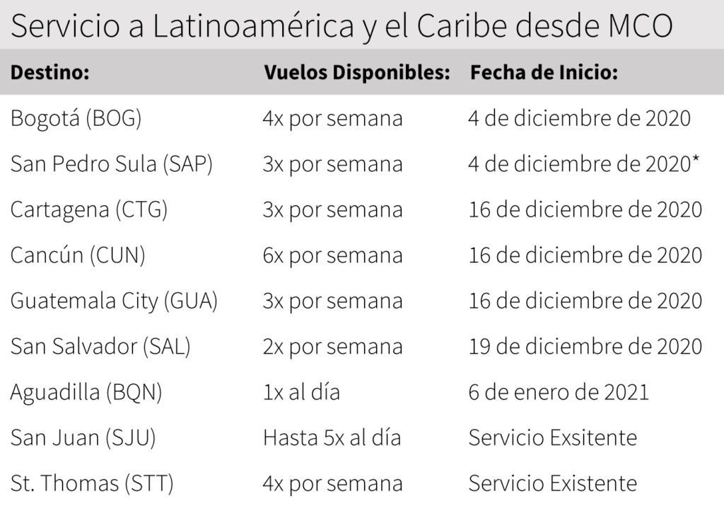 Spirit ha transportado a 2,6 millones de Pasajeros desde y hacia Orlando en el 2019. La aerolínea reactivó la mayor parte de sus vuelos nacionales desde Orlando en julio, a medida que la demanda de viajes aéreos aumentó. La reanudación del servicio internacional de Spirit en MCO incrementa a operar 38 vuelos directos hacia destinos en los Estados Unidos, Latinoamérica y el Caribe. La aerolínea ofrecerá a los Pasajeros un promedio de 53 vuelos cada día durante el mes de diciembre. Eso es un aumento de diez veces en comparación con los cinco vuelos disponibles cada día cuando la demanda de viajes aéreos estaba en su nivel más bajo en el 2020.