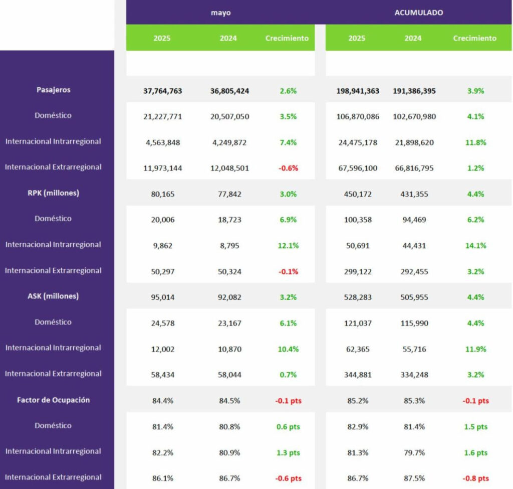 Según el informe de tráfico de ALTA, en mayo de 2025, 37.76 millones de pasajeros volaron en LAC, un incremento interanual del 2.6% con 959 mil pasajeros adicionales. El crecimiento continuó a un ritmo menor que en meses anteriores: 5.3% en abril, 4% en marzo y 5% en febrero.