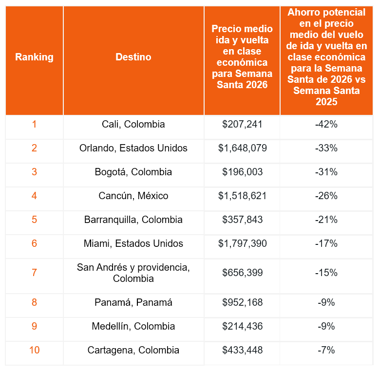 En el plano nacional las mayores oportunidades de ahorro están en Cali, Bogotá y Barranquilla, con una disminución del 42%, 31% y 21% en el precio medio de los vuelos ida y vuelta en clase económica frente a 2025, respectivamente.
