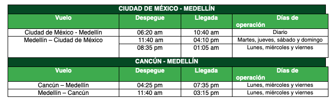 Medellín – Ciudad de México iniciará operaciones el 8 de abril con un vuelo diario, mientras que la ruta Medellín – Cancún comenzará a volar en esa misma fecha con tres frecuencias a la semana (lunes, miércoles y viernes). Los vuelos serán operados con aeronaves Airbus A320 con capacidad para 186 pasajeros que forman parte de la flota más joven de México y la tercera flota más joven de toda Norteamérica, con una edad promedio de cinco años.