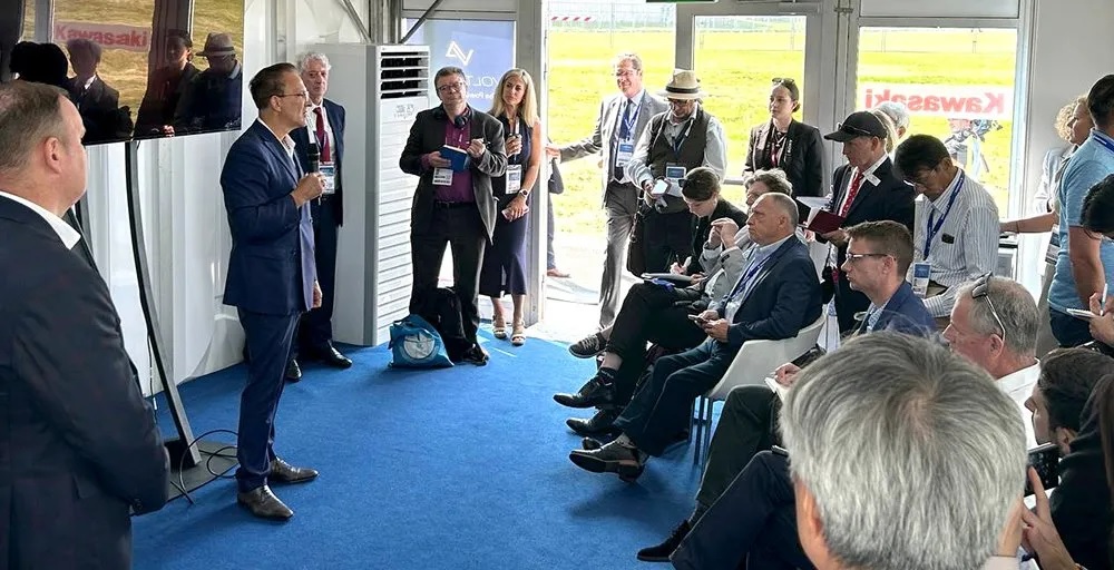 Durante la conferencia de prensa del Salón Aeronáutico Internacional de Farnborough, el director ejecutivo de Sigma Air Mobility, Christophe Lapierre (en el centro), presentó el acuerdo de colaboración de su empresa con VoltAero. Junto a él se encuentra Jean Botti, director ejecutivo y director de tecnología de VoltAero.