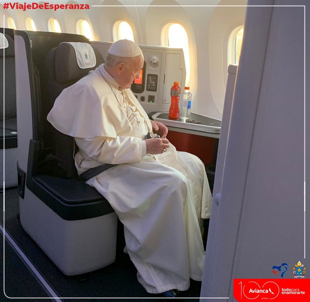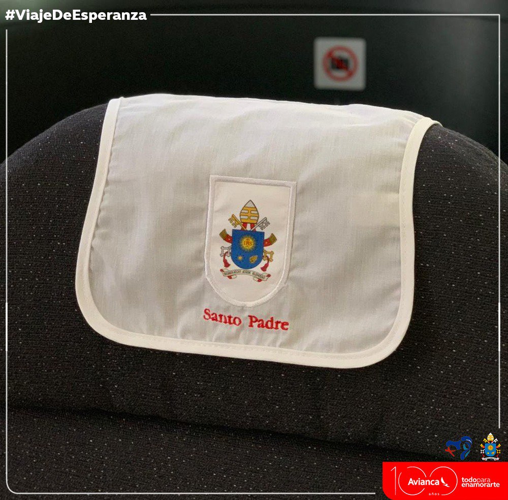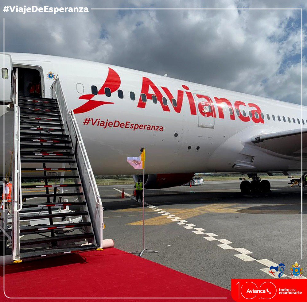 El avión que está trasladando a Su Santidad es un Boeing 787 Dreamliner, que ha sido adecuado para el servicio papal con tres cabinas de pasajeros: la cabina A donde se ubicará el Sumo Pontífice, la cabina B donde irá el séquito papal designado por el vaticano y la cabina C asignada a la prensa acreditada para el cubrimiento de la visita papal. Los espacios fueron ambientados con elementos gráficos alusivos al viaje y el avión cuenta con el escudo del Vaticano, el logo de la Jornada Mundial de la Juventud y el distintivo de #ViajedeEsperanza.